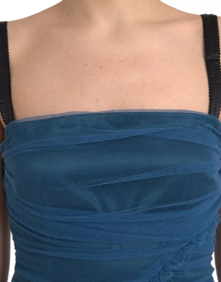 Dolce & Gabbana Blue Mesh Trim Ruched Tulle Sheath Dress